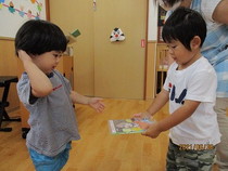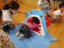 そして、「パネルシアター・虫めがね」では、虫めがねで見て大きく変身した魚の図鑑からサメのトンネルが飛び出してみんなびっくり!恐がりながらもそーっとトンネルをくぐる姿が微笑ましかったです!