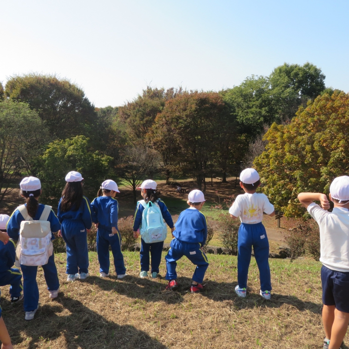 科学館到着後、水の流れる丘を登り、秋の風を感じながら「日光はどっち?(方角)」、「男体山って書いてあるよ」と景色を楽しんだり、丸・細長い・帽子付きなど様々な形のどんぐりと沢山の落ち葉の小径を散歩しました。