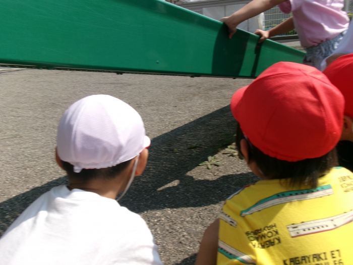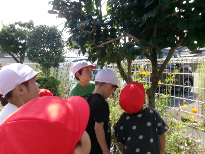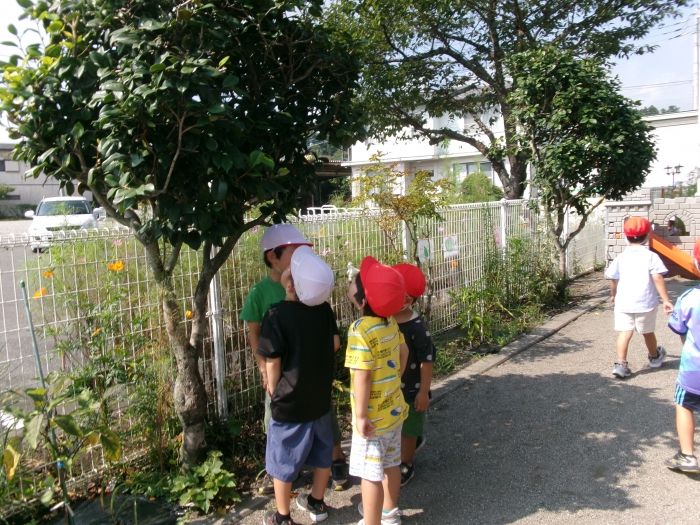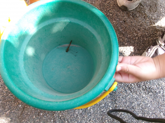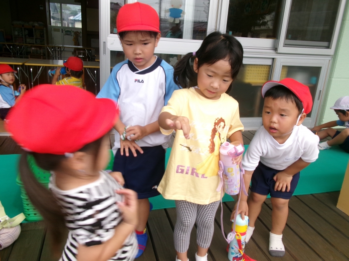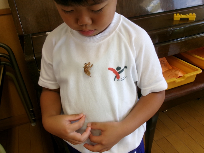 園庭にはおにやんまなどのとんぼやかえる、あり、ちょうちょ、セミなどいろんな虫が遊びに来ています。お外にいる間だけ、捕まえた虫をバケツや虫かごの中に入れて、よーく観察しています。