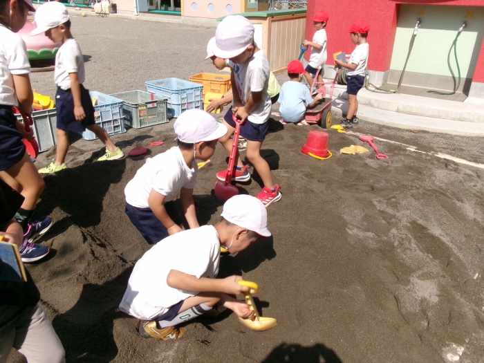 お砂場に山盛りいっぱいの砂を見て子ども達は大喜び!大きな穴を掘ったりお山を作ったりして楽しんでいます。
