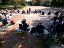 晴れていたので外にレジャーシートを敷き、みんなで円になって食べました。