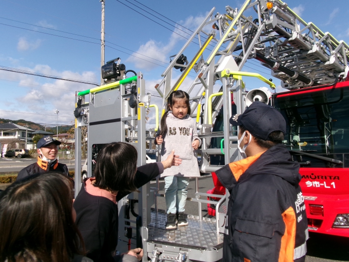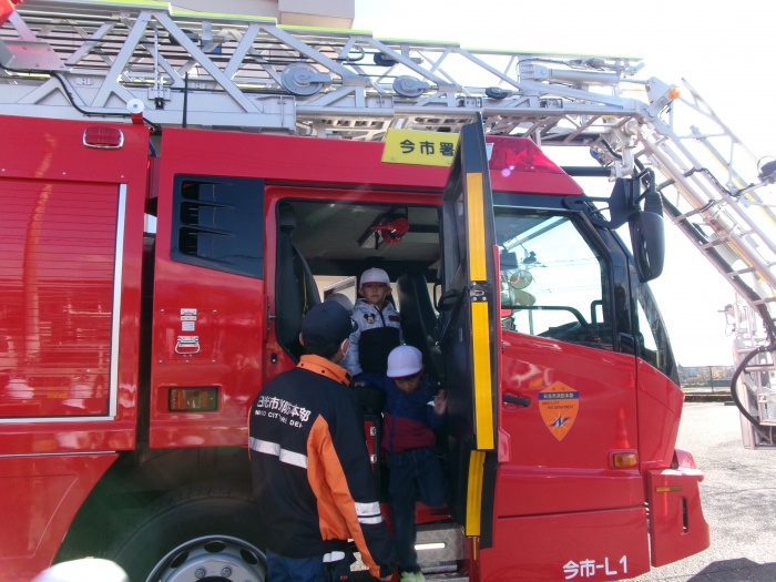 消防士さんのご厚意で、はしご車と救急車を間近で見せてくださいました。はしご車の中やバスケット、救急車の中に入れてくださり、お友達もよーく観察することができました。