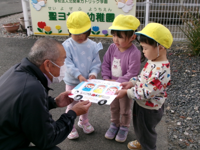 たんぽぽ組さんも、手作りのプレゼントを持って、幼稚園バスの運転手さんに「いつもありがとう」とお伝えすることができました。