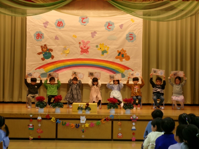 その後はホールへ移動し、お家の方と一緒に手を繋いで入場しました。お友達からお歌のプレゼントや「おめでとう」とお祝いを受け、笑顔でインタビューに移りました。