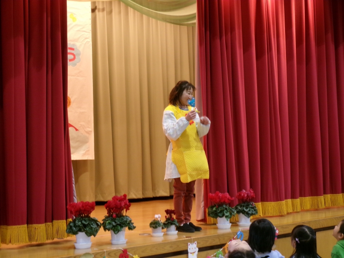 最後に先生からの出し物「ネズミの嫁入り」のエプロンシアターを楽しみました。