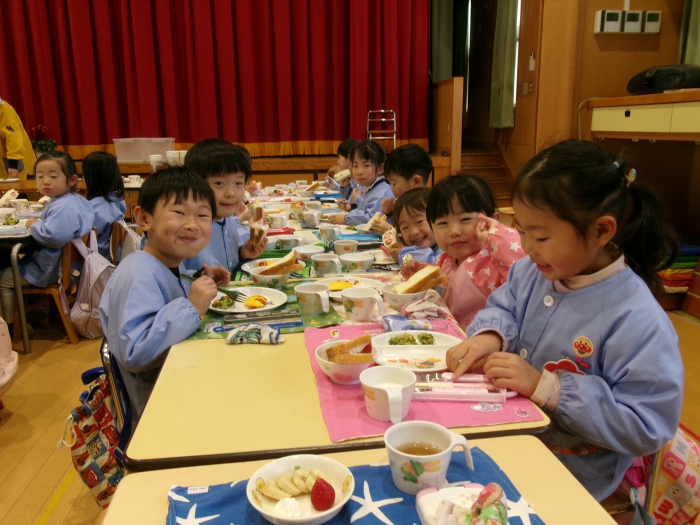 そしてメニューはフルーツサンド!特別な空間で特別メニューということで、子ども達も大喜びで食べました。いつもよりたくさん食べられたお友達も。楽しかったね。