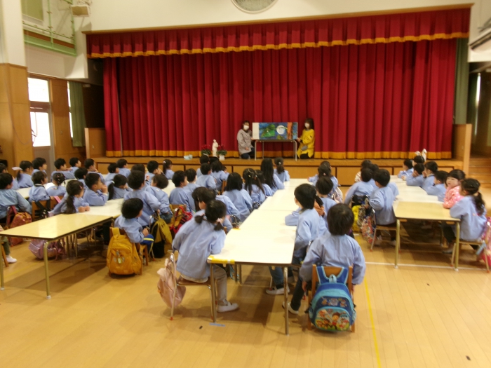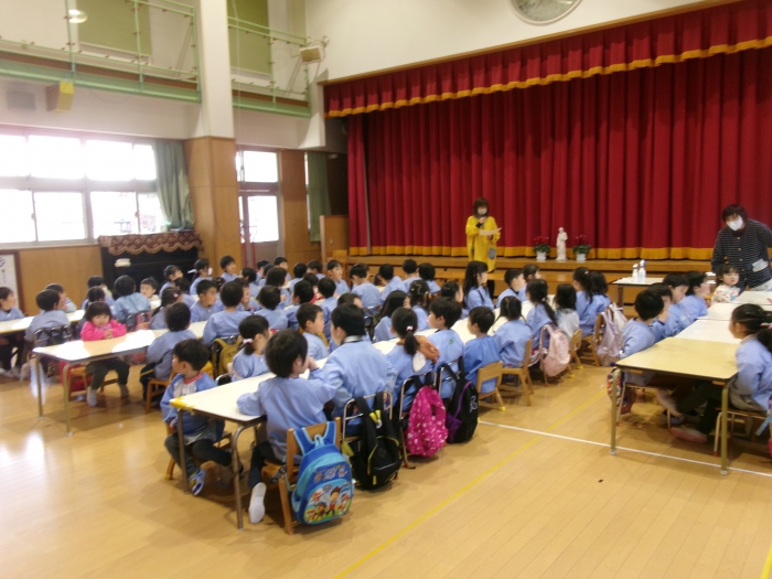 まず、幼児部とうさぎ組のお友達はホールに集まりシールラリーの説明を聞きました。