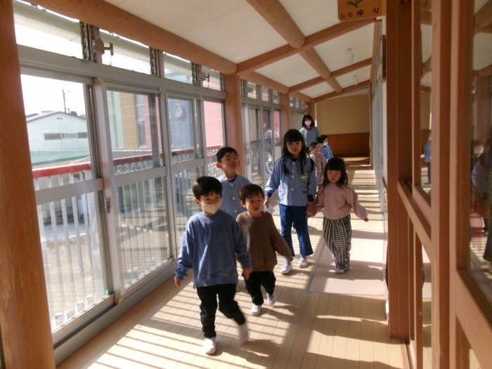 大きいクラスのお友達が小さいお友達を優しく連れて行ってくれる姿は、とても立派でほっこりしました♪