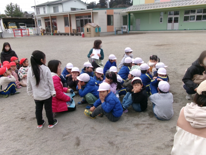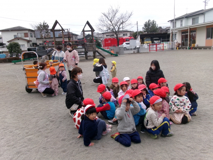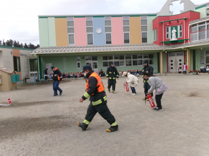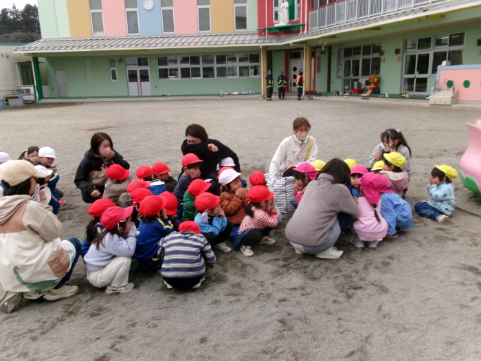 避難訓練後は、子どもたちはテラスに座り、職員の消火器の訓練を見学しました。