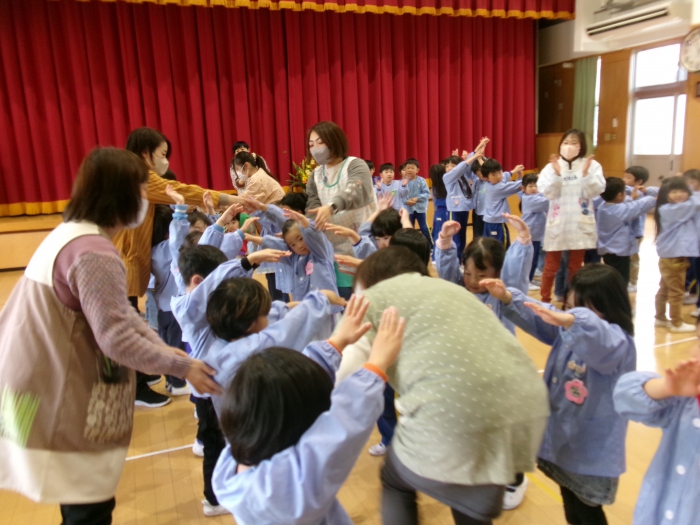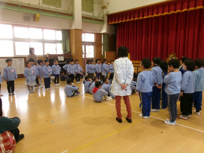 たんぽぽ組、すみれ組、ばら組、そしてまだ登園しているゆり組のお友達がホールに集まりました。