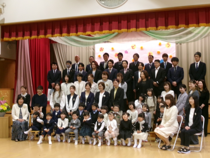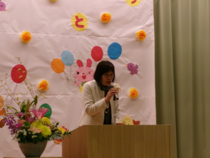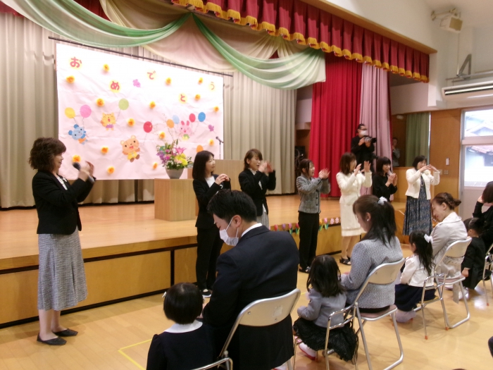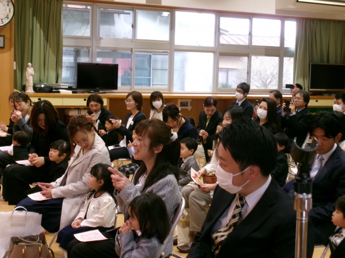 式では、はじめに「まあるいたまご」の手遊びをみんなで歌い、朝のお祈りでは進級の