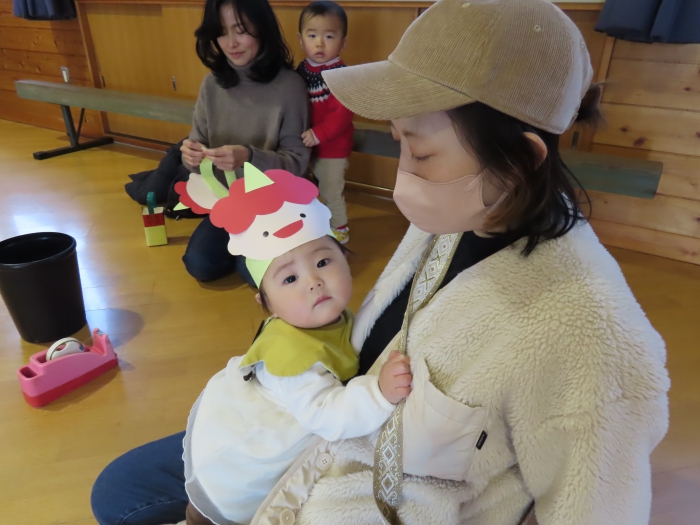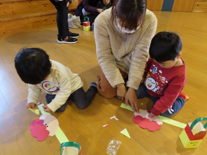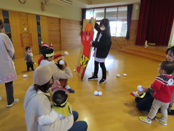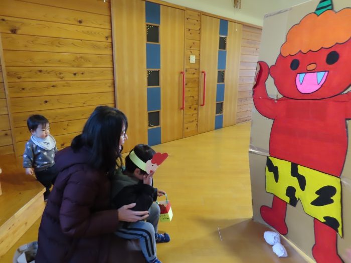 シールを貼ってかわいい鬼さんのお面が完成(*^_^*)