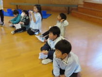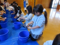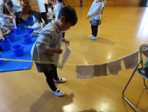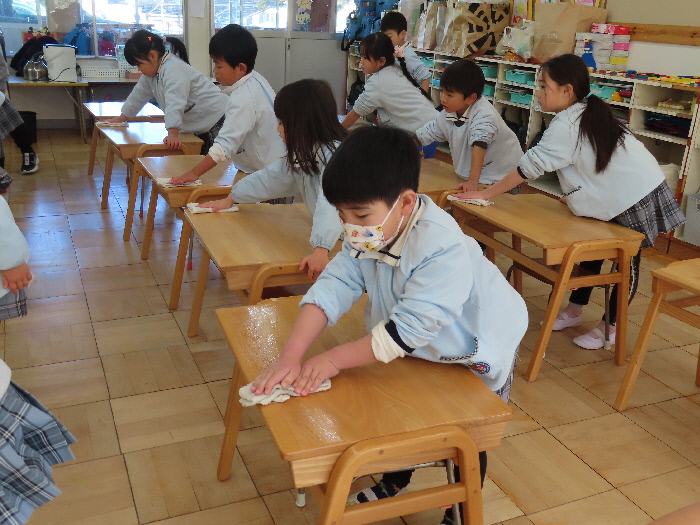 楽しみながら、ぞうきんの絞り方や机のふき方などを学びました。