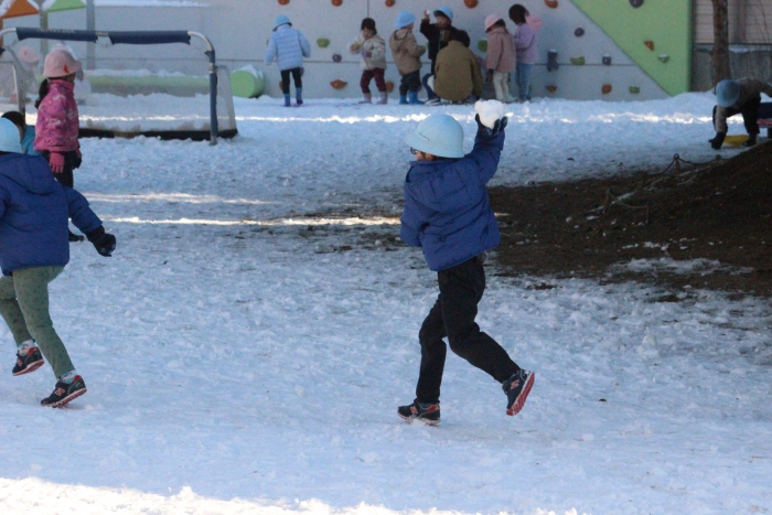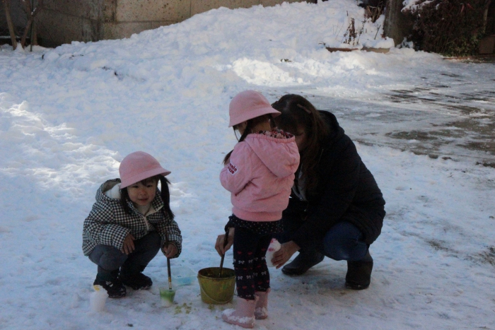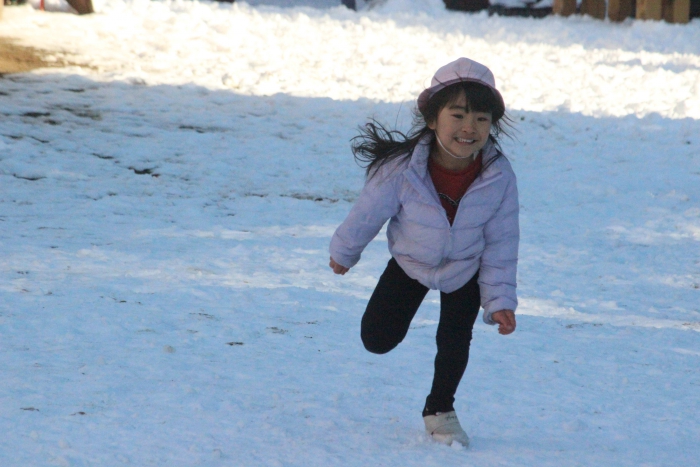 新年早々、園庭に雪が。目を丸くした子どもたちの歓声と走り回る姿。